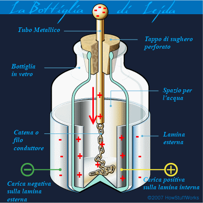 La lamina interna, caricata positivamente, caricava in modo quasi istantaneo la lamina esterna di cariche negative, per attrazione! La presenza dell'acqua facilitava questo tipo di comportamento. Ma non è finita qui.
