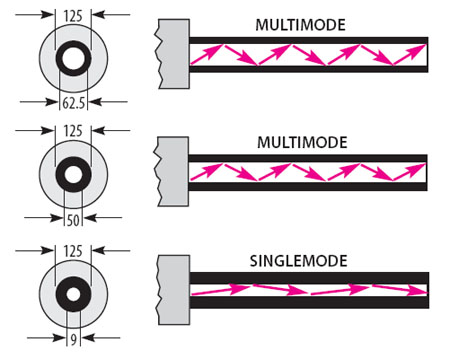 Ciò permette alla luce di propagarsi all'interno del tubo senza disturbi luminosi, "rimbalzando" ripetutamente e con regolarità sulle pareti del tubo. In genere, due solo le modalità di propagazione del onda al loro interno del tubo: monomodale (SMF, Single-Mode Fiber), in cui la luce lo percorre con una traiettoria paralllela e quindi senza rimbalzare sulle pareti, e la multimodale (MMF, Multi-Mode Fiber) in cui si verifica l'effetto contrario. Nella tecnica MMF le diverse informazioni possono essere associate al numero di rimbalzi effettuati dall'onda.