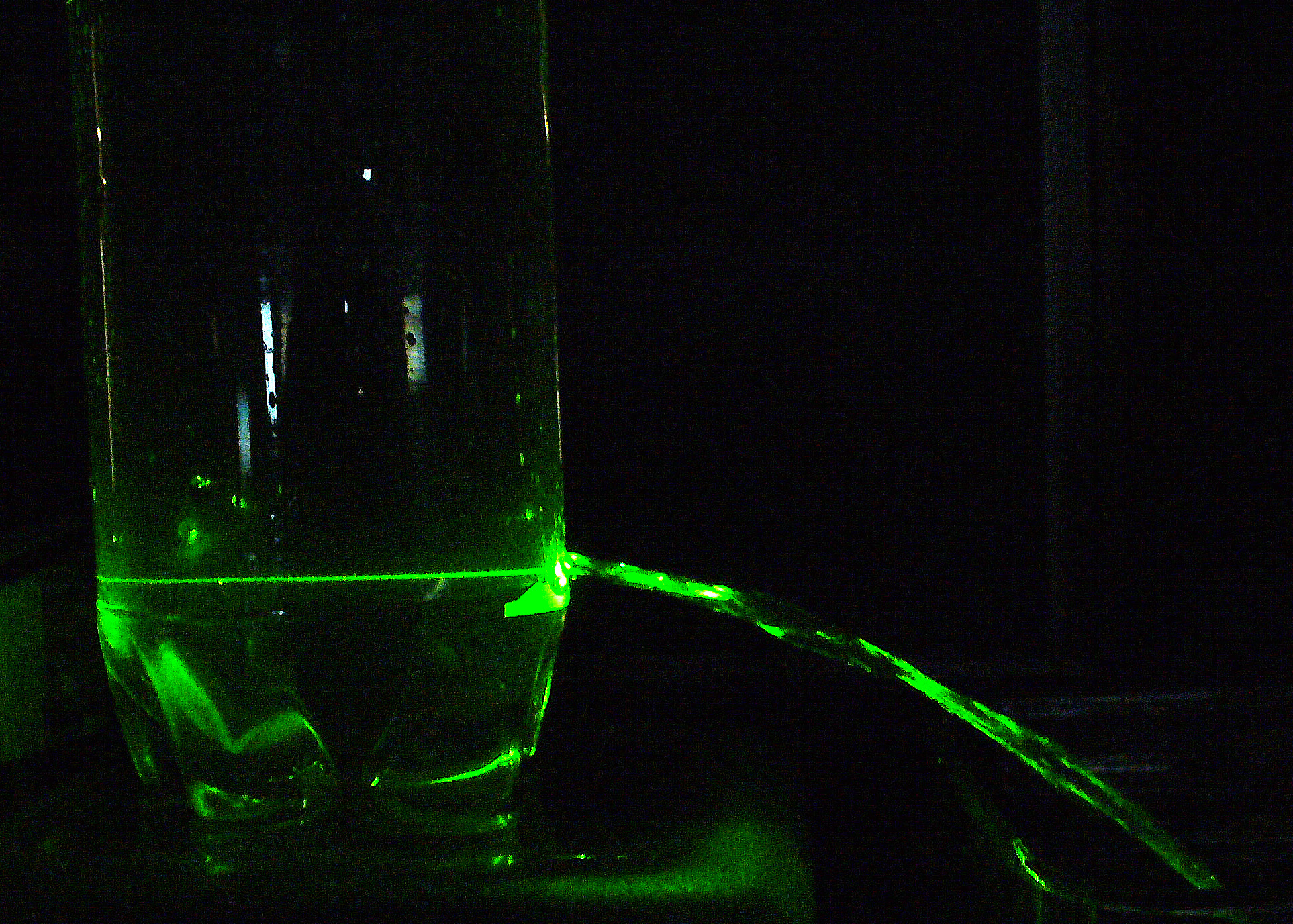 Prendete una bottiglia, dopo averla forata sulla base e opportunamente riempita con dell'acqua tappandone il foro, accendete il laser sotto la base e puntate il laser verso il foro e togliete il tappo. Ah già, abbiamo dimenticato di dirvi... SPEGNETE TUTTE LE LUCI! In tal caso il fenomeno sarà visibile ai vostri occhi e quello che vedrete sarà un fenomeno di questo tipo...